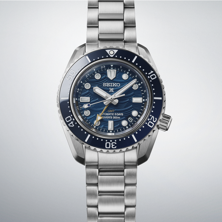 Drawing inspiration from Seiko’s 1968 high-beat diver, the SPB509 introduces a fresh twist with the addition of a GMT complication. This travel-ready tool watch features a bold navy gradient dial that transitions from deep blue to black, all while keeping the wave motif seen in all of the watches in this collection.